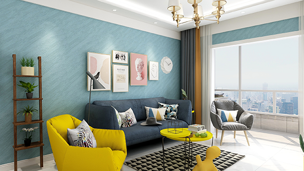 藍色系的基調,是室內更加清新、舒適,搭配明黃色,提亮了室內的亮度,增加了活力。棉麻布料的懶人沙發,增添了室內的舒適感,安全感。大窗戶的設計,改善了室內的視線。房主可以在閑暇的時間眺望遠景,減輕壓力、放松心情;也減少了房內壓抑的氛圍,視覺上拓寬了空間。