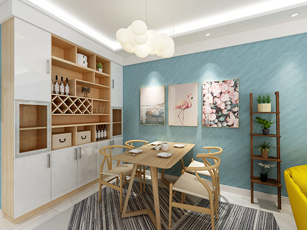 木制桌椅和盆栽相互呼應,體現人與自然的結合。白色的頂燈與整體和諧,又體現亮點,是點睛之筆。餐桌柜+卡座+收納的設計,時尚、體現設計感,幾乎不占什么空間,又能將很多生活的雜物收納其中,實用兼具美觀。