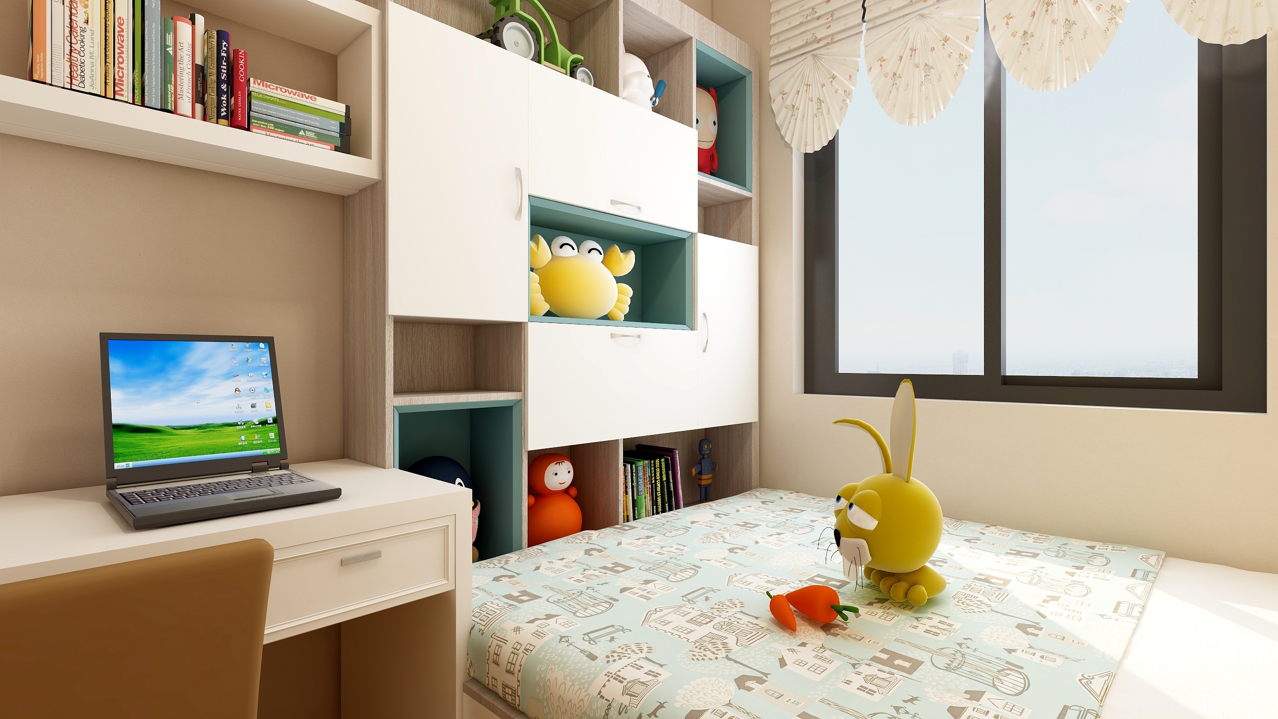 玩具的裝點使兒童房充滿溫馨的同時更具童趣,黃色、橙色、米白色整體色系和諧,想象小朋友一定會愛上這樣的裝扮。生態環保的墻壁,讓孩子在開心的同時睡得更放心。