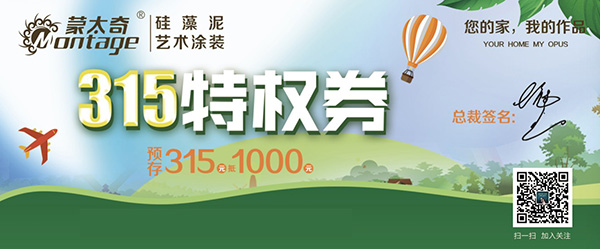 作為蒙太奇硅藻泥北京直營開年大促活動,總部投入千萬禮金惠民補貼,客戶預存315元定金,可獲得總裁簽名的“315特權券”。(*每戶只能使用一張。)